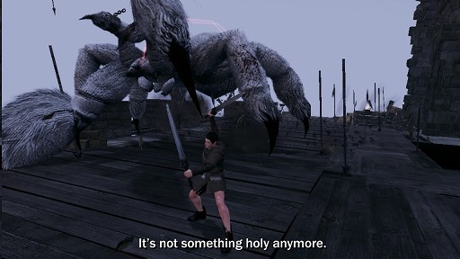 また,槍のようなものが空から降り注ぎ,そのクリーチャーに刺さっていく様子や,男性キャラが女性キャラを“お姫様抱っこ”して歩くシーンにも注目してほしい。