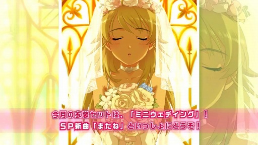「ミニウェディング」。アイドル達の純白のウェディングドレス姿を見たいような,見たくないような,何とも複雑な気持ちになるかも……。この衣装は,響・貴音・美希も着ることができる。そして今月はさらに,Xbox 360版「