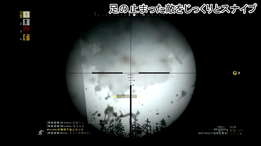 ちょっとした被弾が死に結びつき,敵はすぐに隠れたり伏せたりする。遮蔽物が少なく一気に距離を詰めるような戦い方も難しい。このような状況を理解すれば,自ずと遠距離での狙撃を中心とした戦い方になるし,狙撃するにしても,居場所を悟られないようにこまめに移動を繰り返すような地味な戦い方を強いられる。たとえ所有している武器がアサルトライフルであろうと,接近戦のリスクを無視できないこともあり,命中率やスコープの倍率を無視してでも,狙撃に偏った戦い方になる。