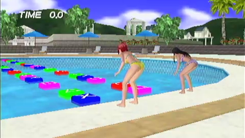 プールに浮かんだフロートの上をぴょんぴょんと渡ってゴールを目指す。フロート同士の間隔に応じてボタンのチョン押しと長押しを使い分け,プールに落ちないようにするのが重要だ。フロートに描かれたマークと同じボタンを押して跳び乗ると,ゴールしたときにボーナスポイントが獲得できる。余裕があれば狙ってみよう。