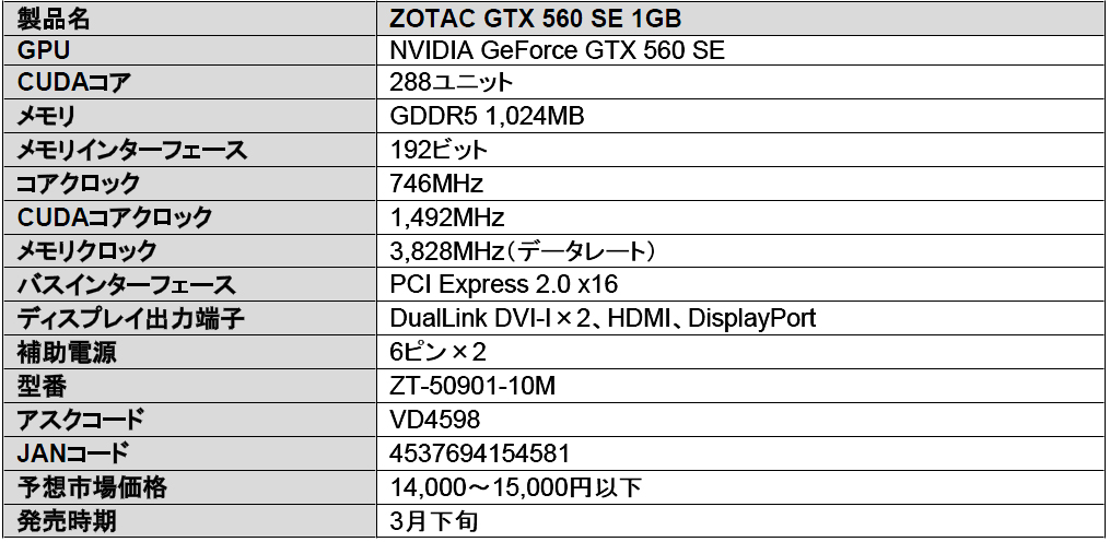 アスク,ZOTAC製のGTX 560 SEカードを発売。想定売価は1万円台半ば