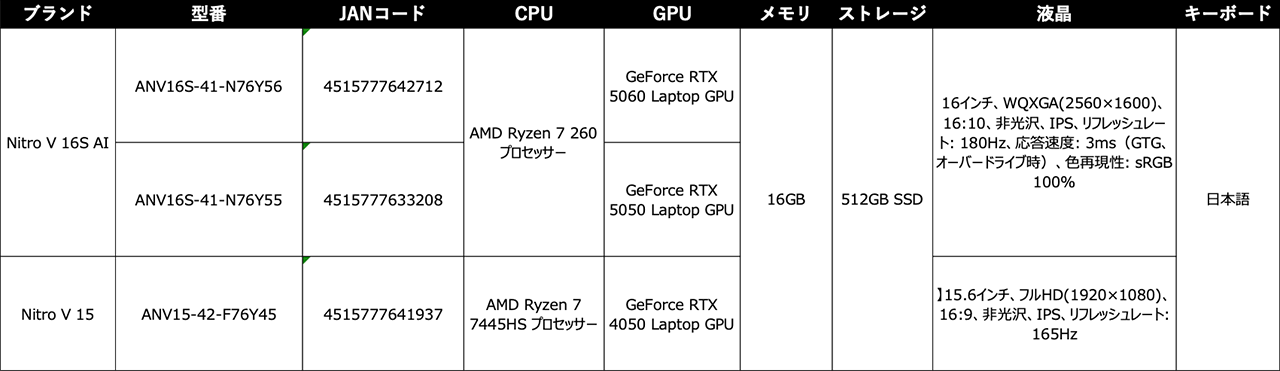 Ryzen AI搭載のゲーミングノートPC「Nitro V 16S AI」など3モデルを発売