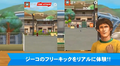 ステージ中には,空き缶やゴミ箱,ゴールにかけたユニフォームを的にしている場面など,ジーコ氏が実際に経験したことを,スマートフォンを通して体験することができる。