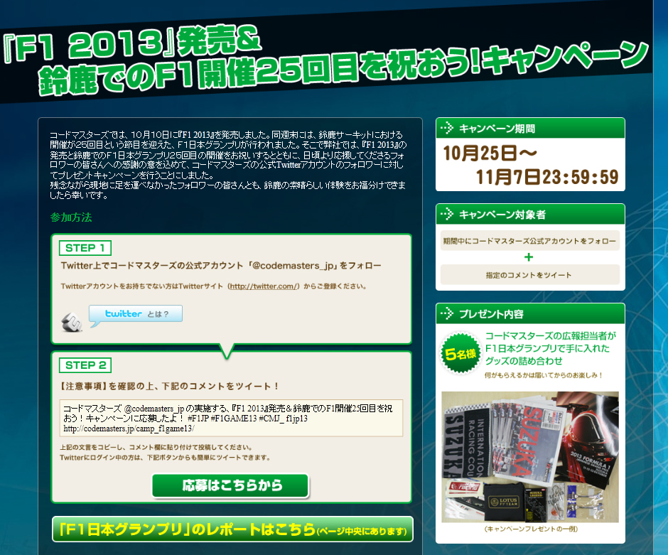「F1 2013」の発売などを記念したTwitterキャンペーンがスタート