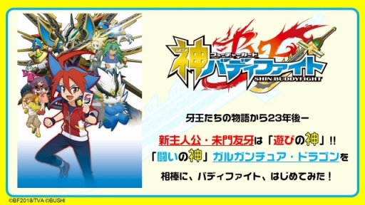 これまで主人公の“太陽番長”こと未門牙王を中心とした熱い物語が描かれてきたテレビアニメシリーズ。「神バディファイト」は前シリーズから23年後,牙王の息子である未門友牙(CV:真野拓実)を主人公に新たな物語が展開する。