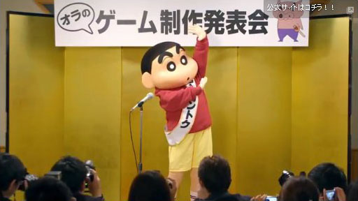 本日より、本作の公式HPにて第1弾PVを公開いたしました。「オラがカントク」と書かれたタスキを身に着けて、しんのすけ監督が登場。そして、しんのすけ監督の頭上には「オラのゲーム制作発表会」の看板が。