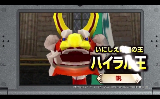 ハイラル王は,ニンテンドーゲームキューブ用ソフト「ゼルダの伝説 風のタクト」に登場していたキャラで,武器である「帆」を魔法で操って戦うほか,船の姿をした「赤獅子の王」に姿を変えて攻撃することもできる。