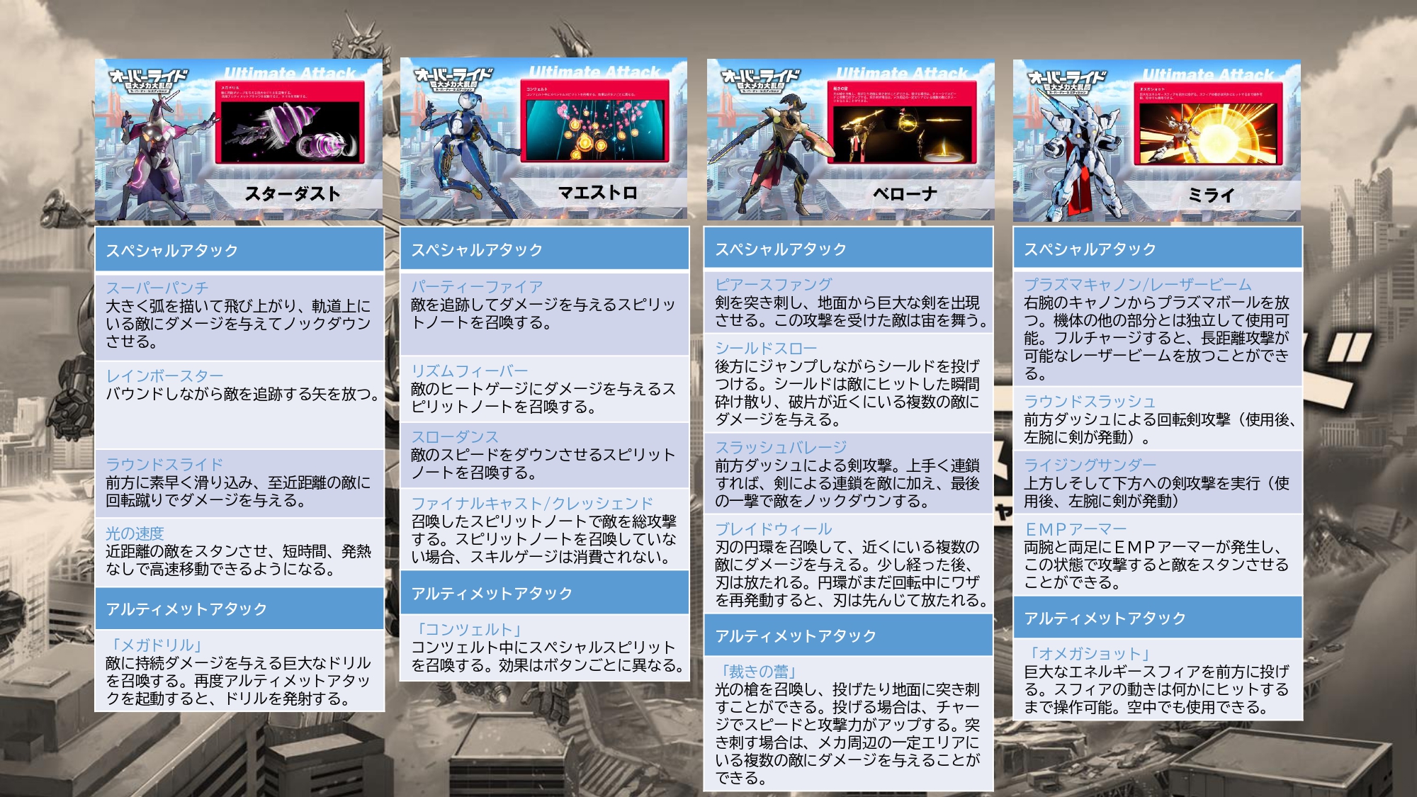 Switch版「オーバーライド 巨大メカ大乱闘 スーパーチャージエディション」,メカ全16機の能力をまとめた「全ワザ収録のスペシャルメカ図鑑」が公開