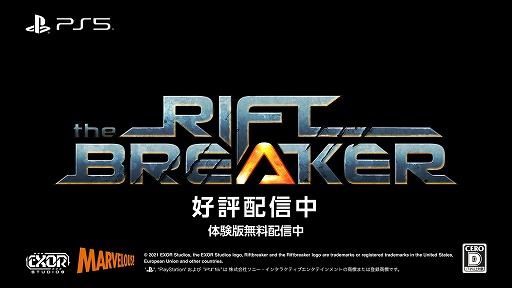 製品概要 タイトル The Riftbreaker(リフトブレイカー) 対応機種 PlayStation®5 ジャンル 基地建設サバイバルアクション 配信日 好評配信中 希望小売価格 ダウンロード版:3,000円+税 プレイ人数 1人 CERO D 権利表記 c 2021 EXOR Studios, the EXOR Studios logo, Riftbreaker and the Riftbreaker logo are trademarks or registered trademarks in the United States, European Union and other countries. 企画・開発 EXOR Studios 販売 マーベラス 公式サイト https://riftbreaker.marv.jp/