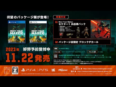 株式会社ハピネット(本社:東京都台東区、代表取締役社長:榎本誠一、証券コード:7552)は、カナダ最大のゲーム開発・販売会社であり、大ヒットゲームタイトル『Dead by Daylight』の制作会社でもあるBehaviour Interactiveが2023年4月にリリースした『Meet Your Maker』について、PS5/PS4用のパッケージ版を2023年11月22日(水)に発売することを決定しました。パッケージ版には、「セクター1 兵器庫パック」や「パッケージ版限定ブロックデカール」が同梱されます。