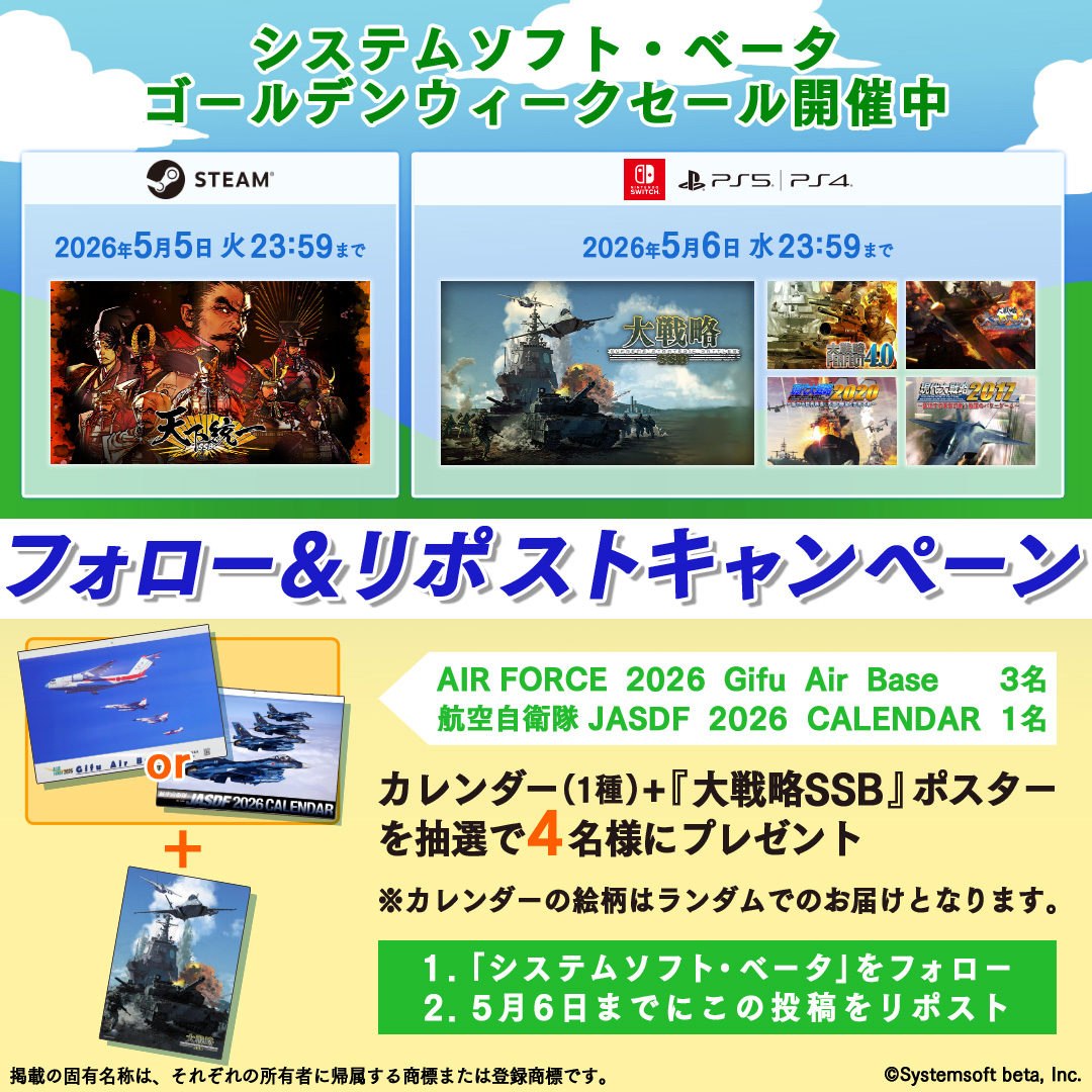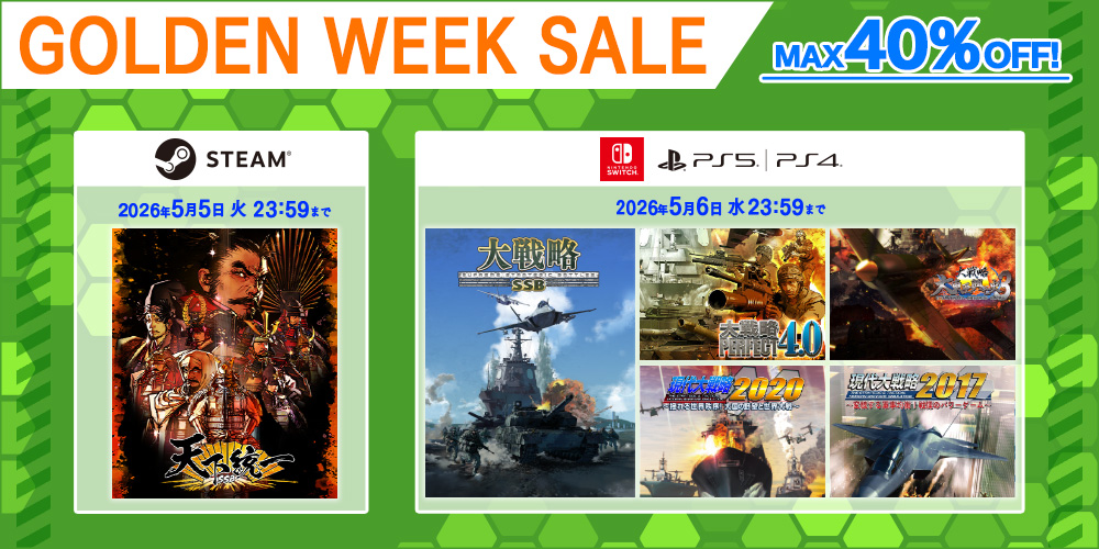 「大戦略SSB」「大戦略パーフェクト4.0」「天下統一SSB」「萌え萌え2次大戦(略)3」などが最大40%オフに。GWセールを開催中